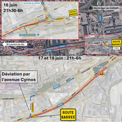🚋 Tramway ligne 4 🚋 St Laurent du Var – Route du bord de mer FERMETURE A LA CIRCULATION DE NUIT Pour la dépose de la passerelle piétonne qui enjambe la RM 6098, la Route du Bord de Mer sera fermée à la circulation : Le 16 juin : – De 21h30 à 6h... ......